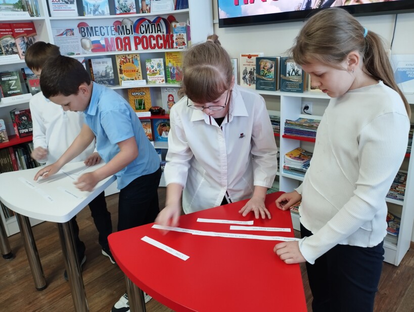 Участникам было дано задание: на каждую букву в слове «солдат» назвать главные качества настоящего защитника. Затем школьники прослушали отрывки известных литературных произведений А.Твардовского «Василий Теркин», Б.Полевого «Повесть о настоящем человеке», С.Алексеева «Медаль», Л.Кассиля «Памятник советскому солдату», А. Толстого «Русский характер» и по описанию сюжета определили, какими качествами обладает литературный герой. Работая в парах, сложили пословицы о героях.