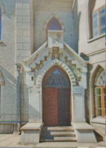 Небольшой особняк похож на старинный рыцарский замок со стрельчатыми окнами и двумя восьмигранными башнями, балконами, террасами и галереями. Он сложен из местного серого известняка.