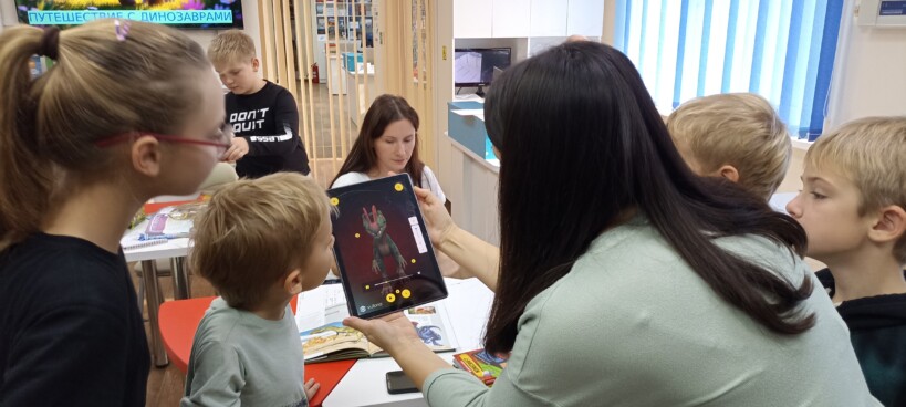 В завершение мероприятия библиотекарь представил детям книги с дополненной реальностью, которые позволяют рассмотреть динозавров в движении и увидеть их особенности строения тела.
