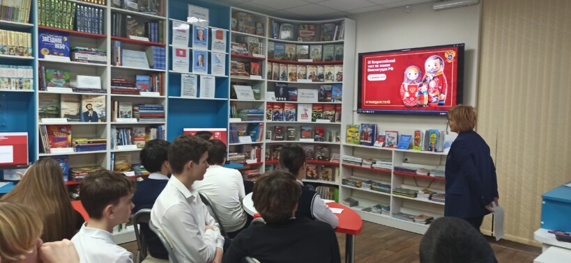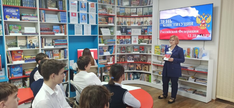 Библиотекарь пригласила юных читателей к прохождению Всероссийского теста на знание Конституции РФ и коротко ознакомила с книгами, представленными на тематической полке правовой литературы «Основной закон страны — Конституция».