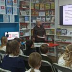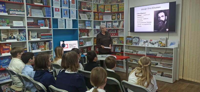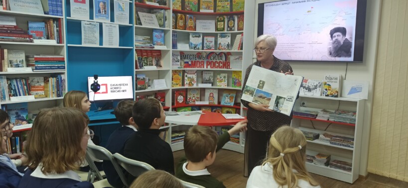 В модельной детской библиотеке-филиале №8 «Книгоморье» для юных читателей 5-В класса школы №9 прошел час любознательных открытий, посвященный выдающемуся исследователю Отто Юльевичу Шмидту. Это мероприятие проходило в рамках культурно-просветительского проекта «Во славу России!» и Недели занимательной науки «Читаем. Познаём. Исследуем».
