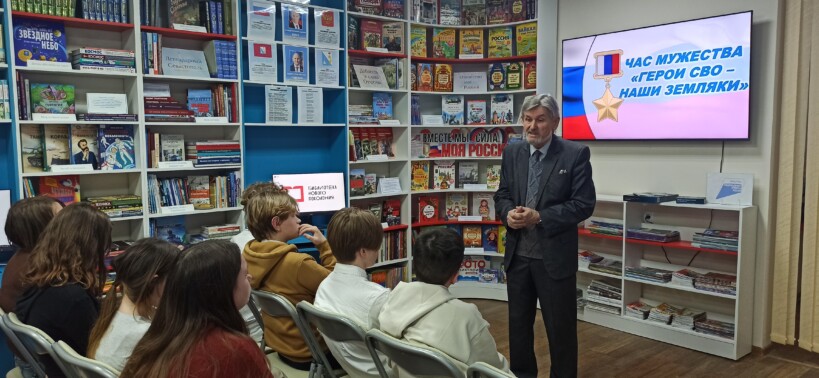 Для беседы с учащимися 7-Б класса школы № 40 имени Г.А. Александера в библиотеку был приглашён Ковалёв Юрий Леонидович. Это учитель философии и обществознания школы № 23 и отец участника СВО. Юрий Леонидович подробно объяснил ребятам причины начала СВО, цели и задачи, которые стоят перед Россией, достижение которых лежит на плечах наших военнослужащих. Он также представил нашим юным читателям свой рассказ «Русский солдат Василий или майский пикник». В нём рассказывается о родителях, которые сильно обеспокоены молчанием сына в сложившейся обстановке в первые месяцы СВО. Они отправились в опасное путешествие, чтобы получить какие-нибудь сведения о нём и лично передать сыну и его товарищам тёплые приветы и небольшие гостинцы от родных и близких.